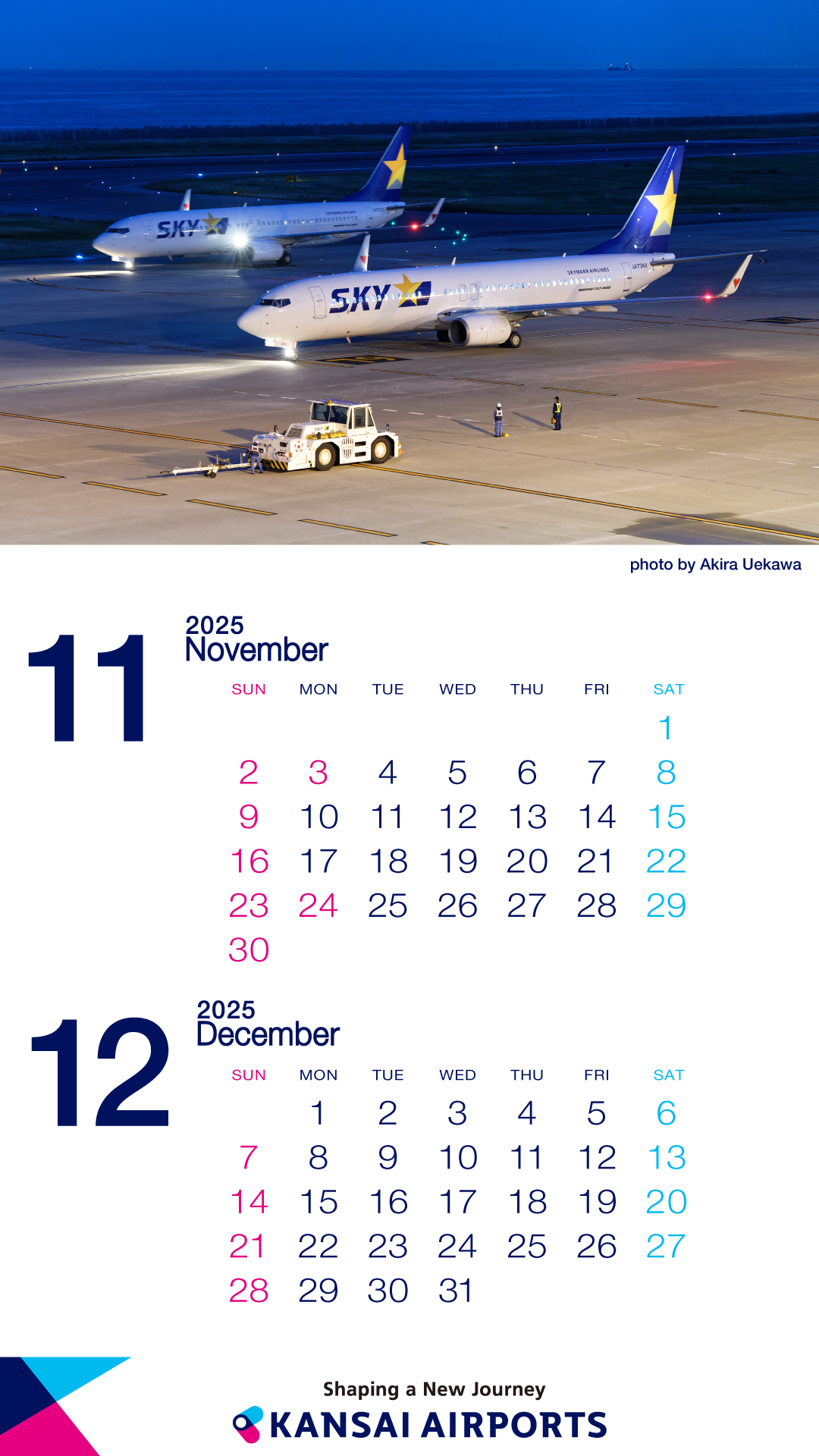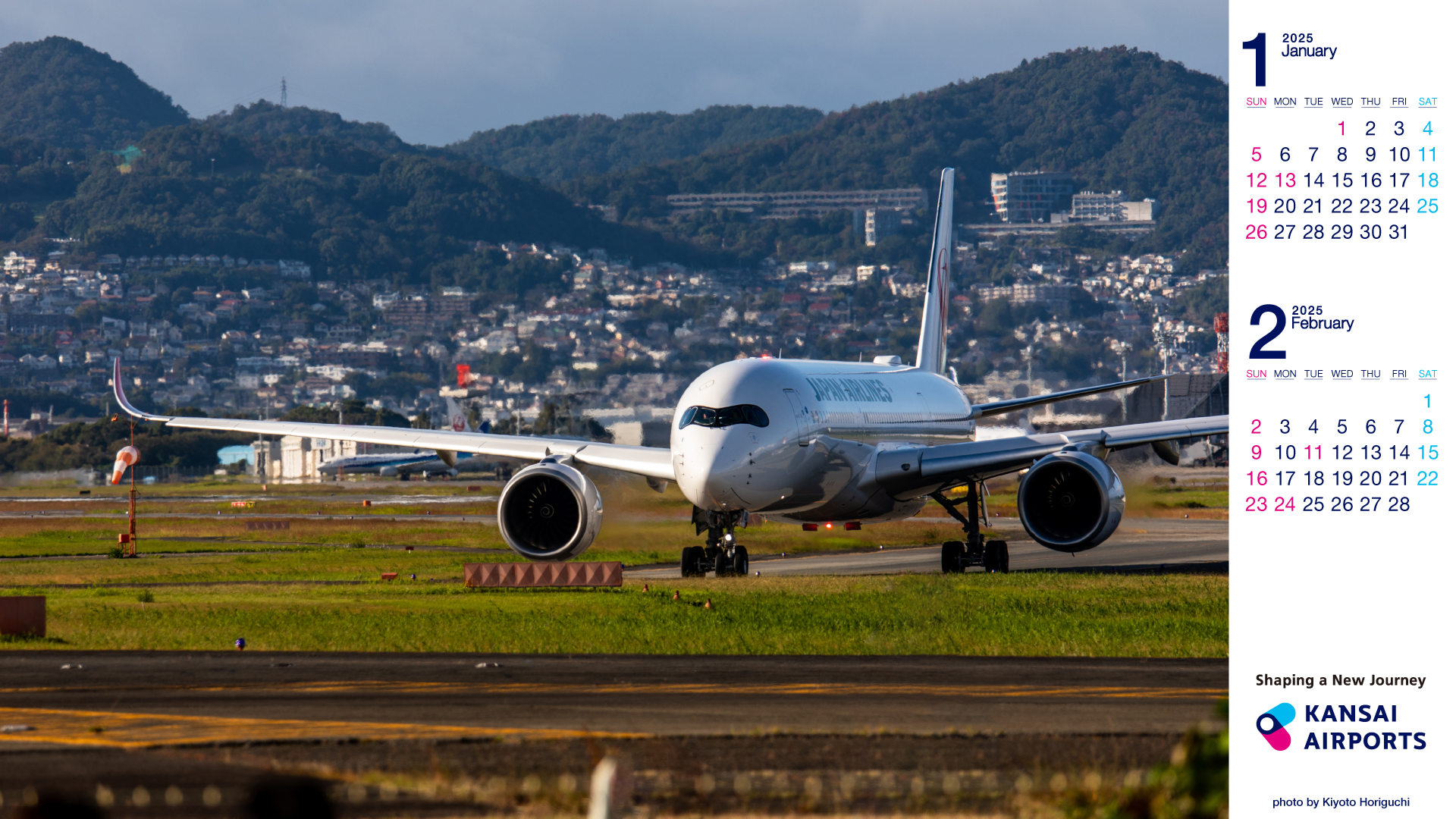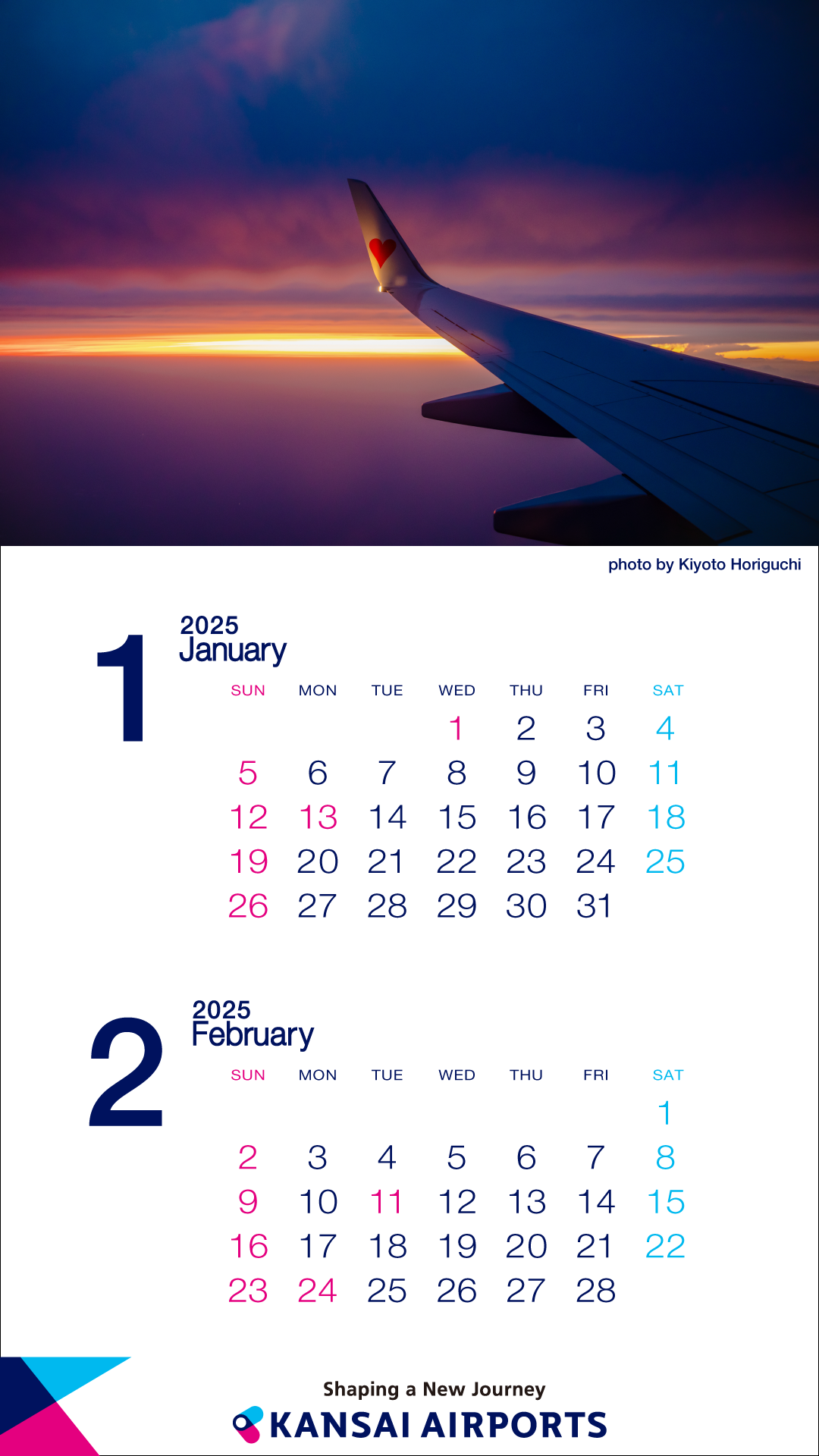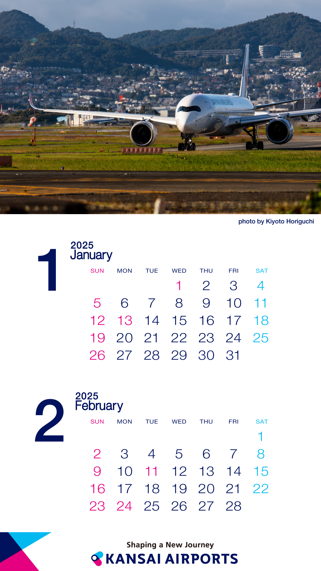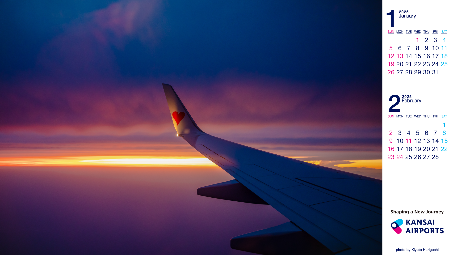 いつも空港や航空機の美しい情景に触れていただき、空に想いを馳せていただきたいという願いをこめて制作しました。お手持ちのデバイスのデスクトップや壁紙に設定してお使いいただくことができます。4ヶ月ごとにカレンダーをまとめた、ビジネスシーンにも便利な関西3空港バージョンと、2ヶ月ごとに変化する風景をお楽しみいただけるバージョン(各2種類)です。2025年も関西3空港からの風景をお楽しみください。