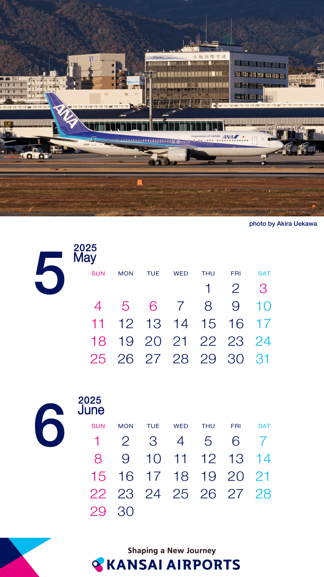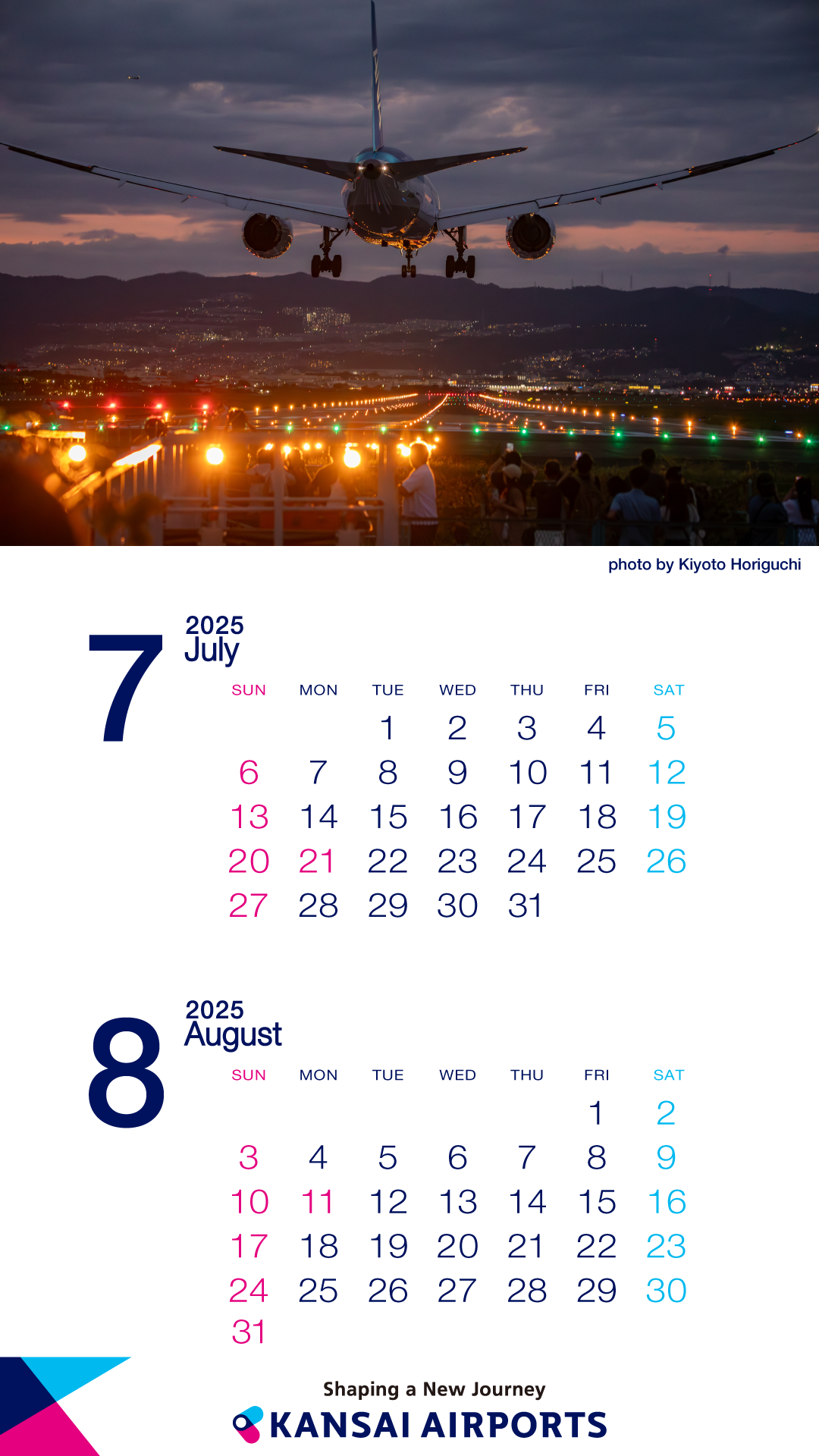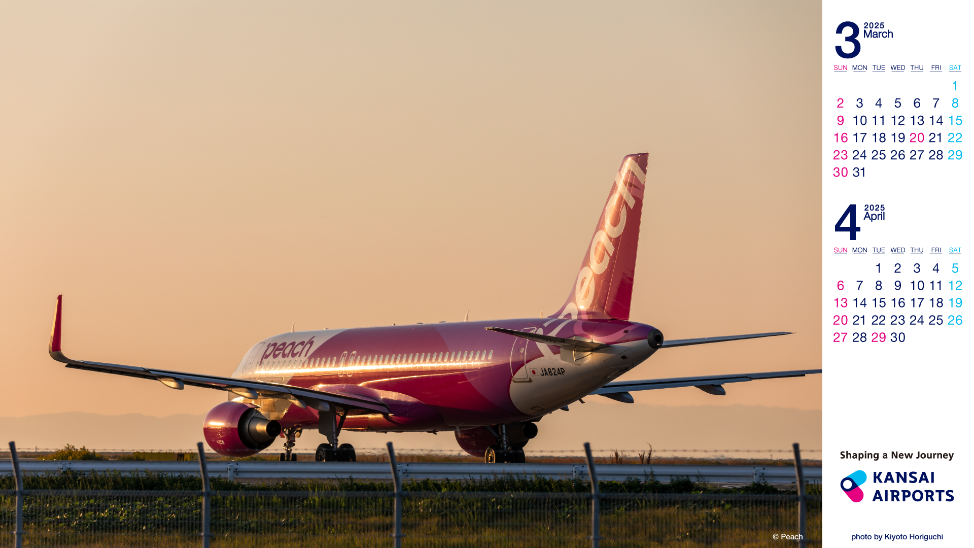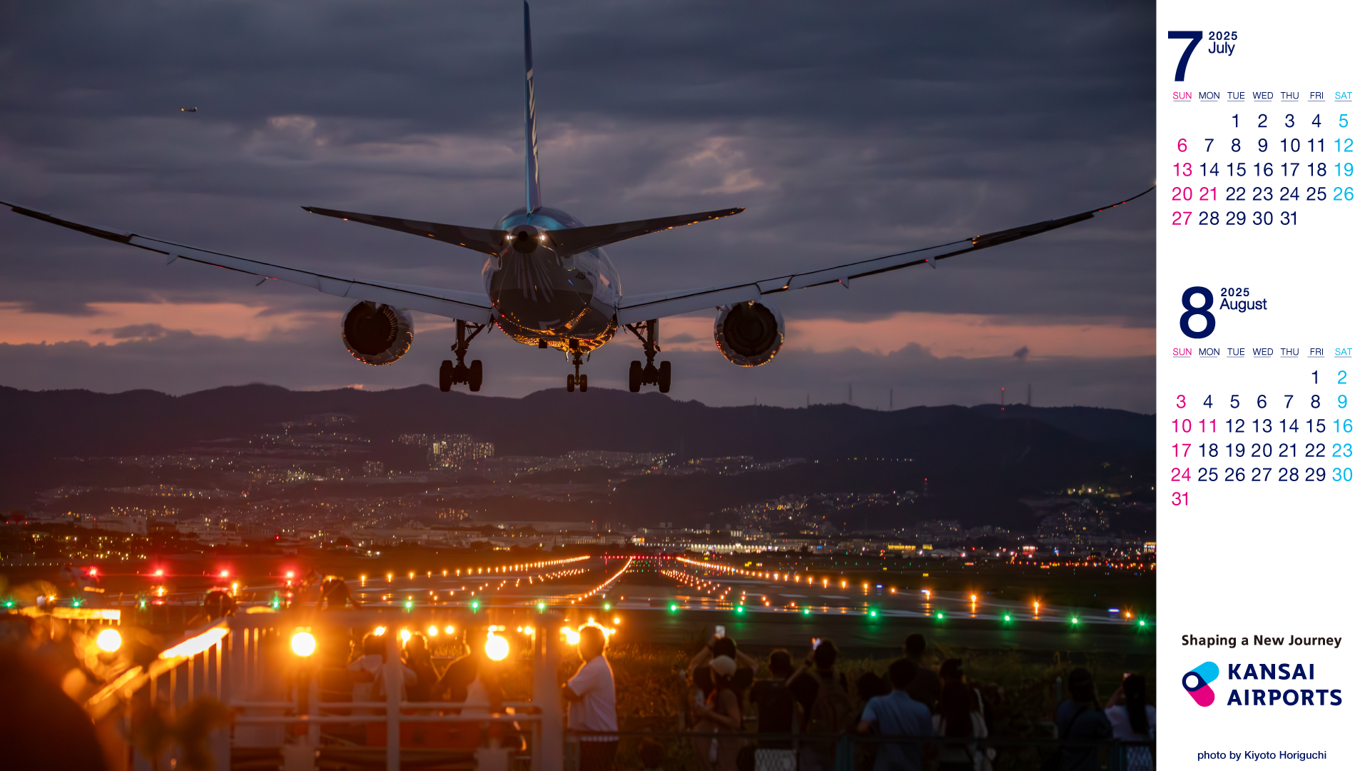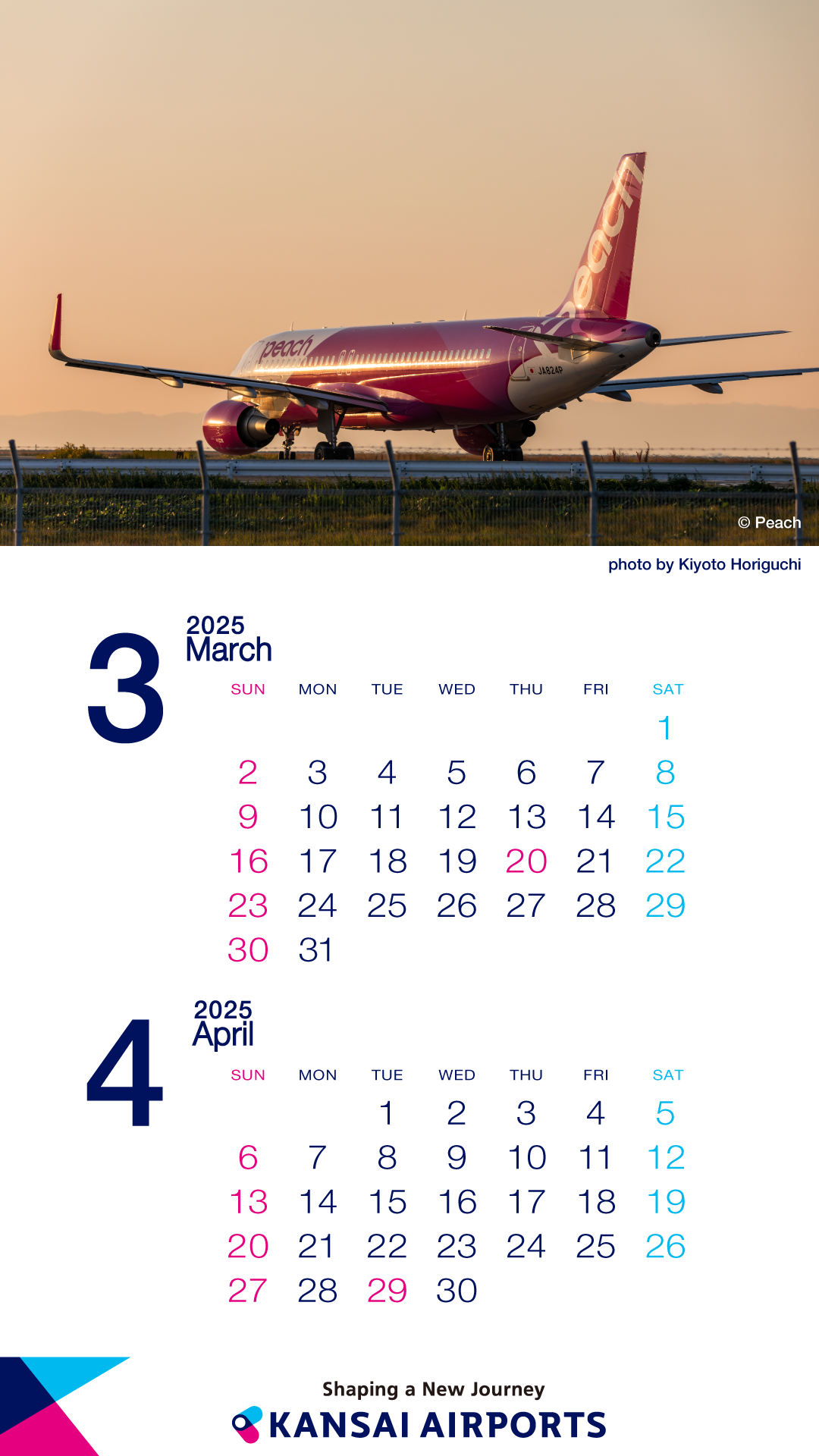 いつも空港や航空機の美しい情景に触れていただき、空に想いを馳せていただきたいという願いをこめて制作しました。お手持ちのデバイスのデスクトップや壁紙に設定してお使いいただくことができます。4ヶ月ごとにカレンダーをまとめた、ビジネスシーンにも便利な関西3空港バージョンと、2ヶ月ごとに変化する風景をお楽しみいただけるバージョン(各2種類)です。2025年も関西3空港からの風景をお楽しみください。