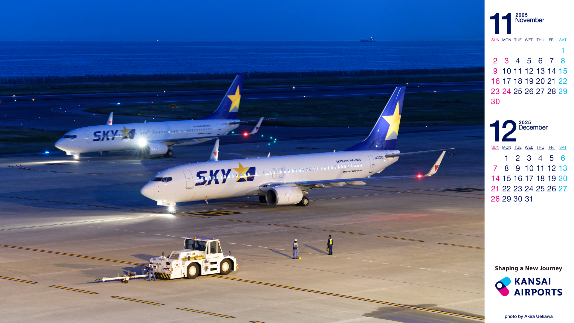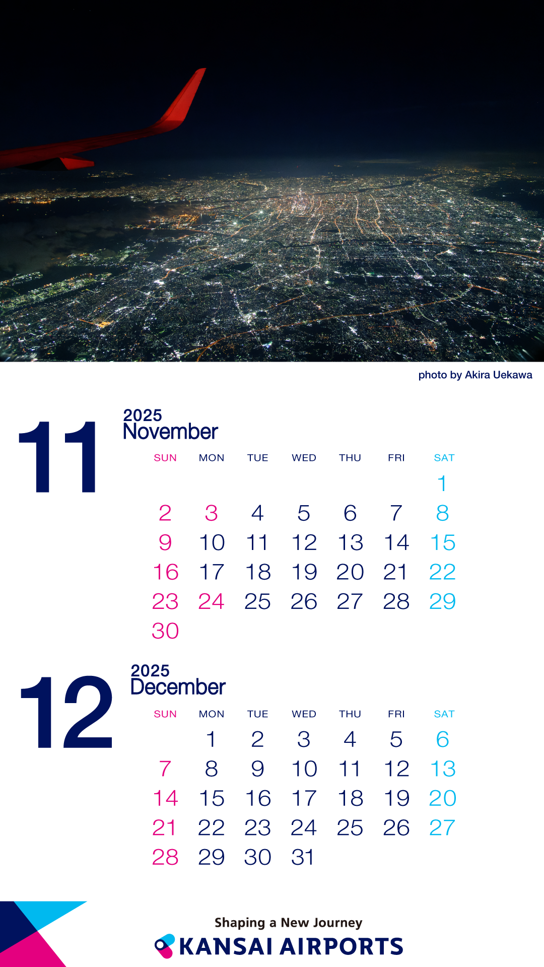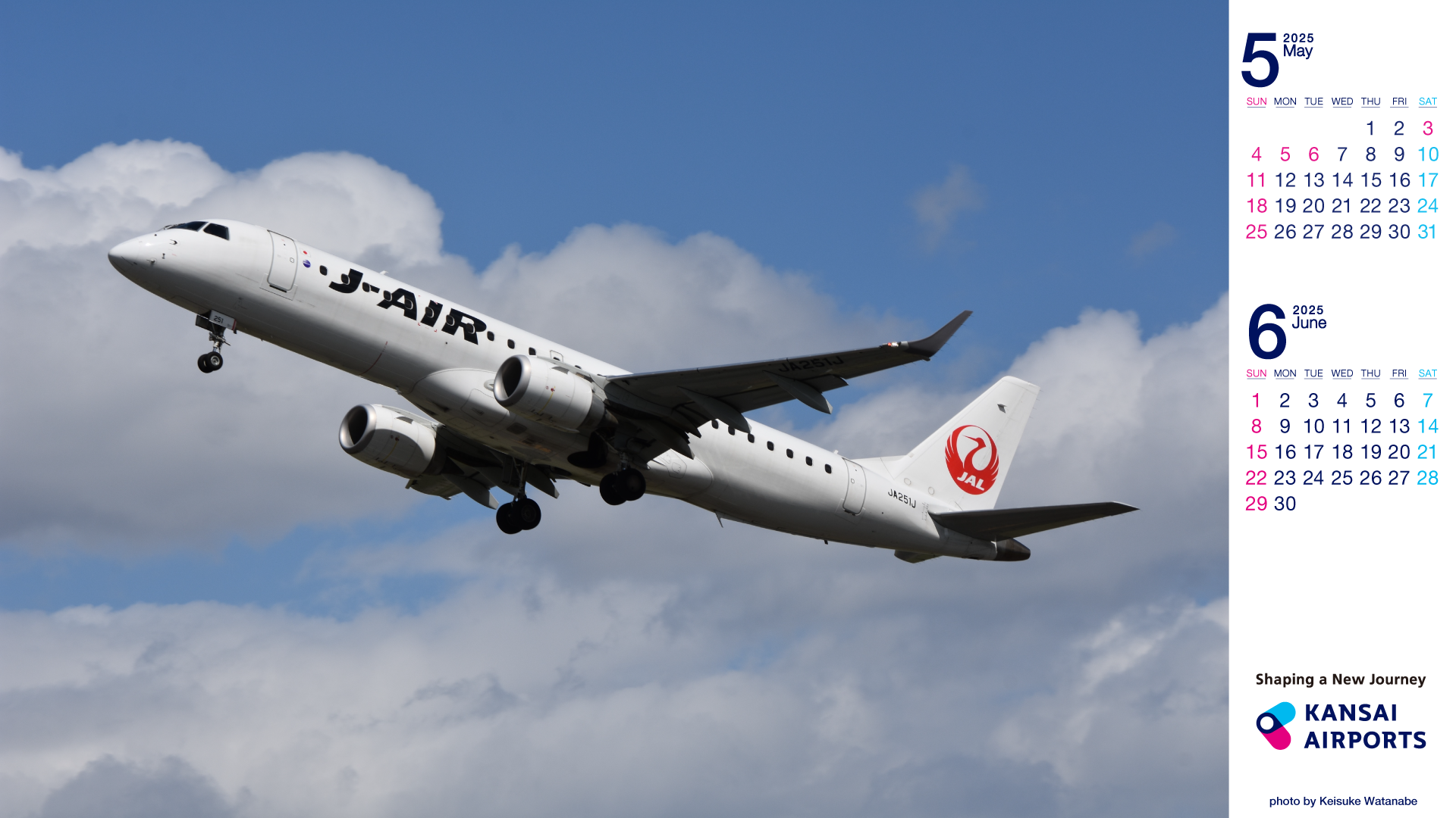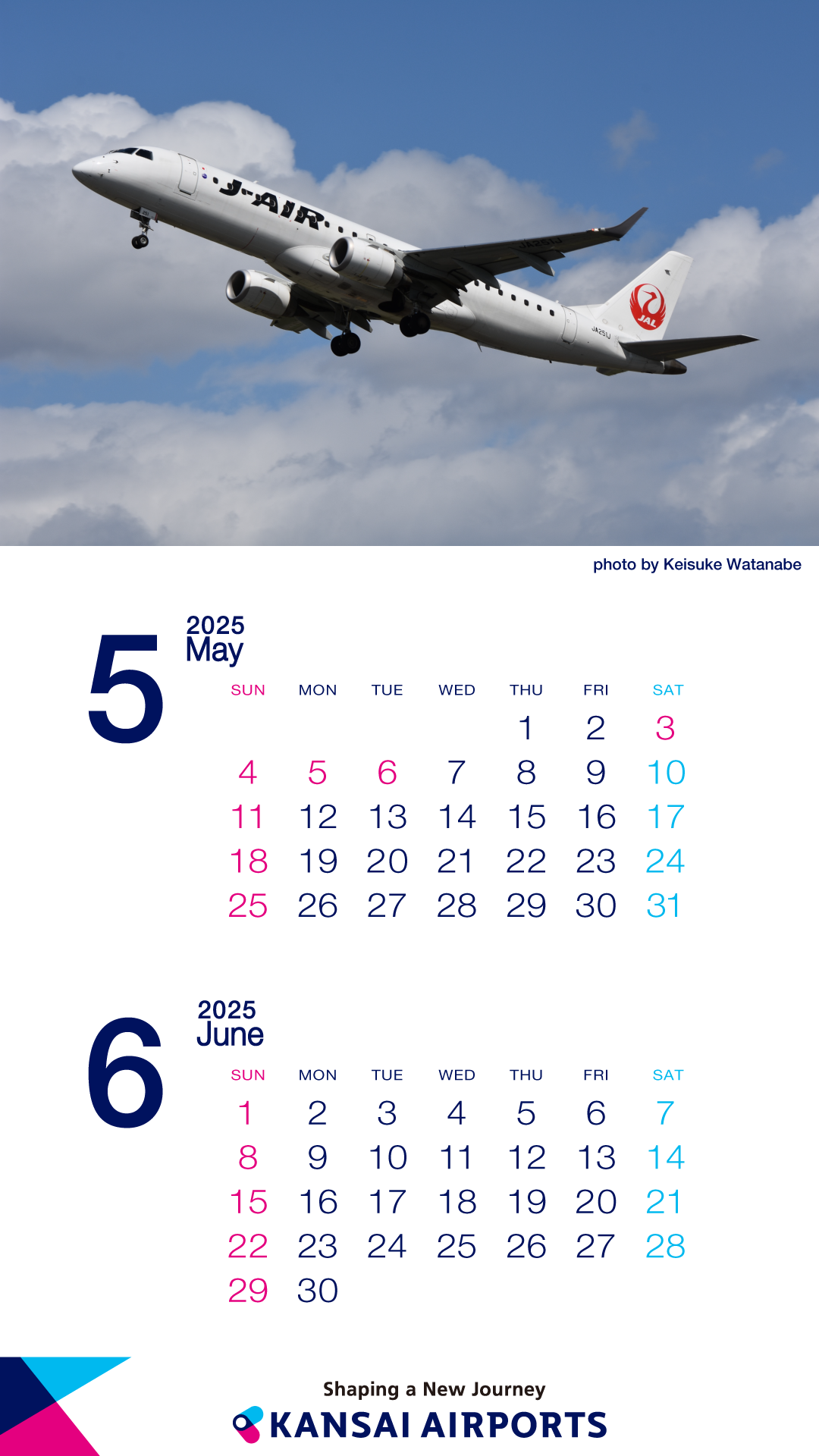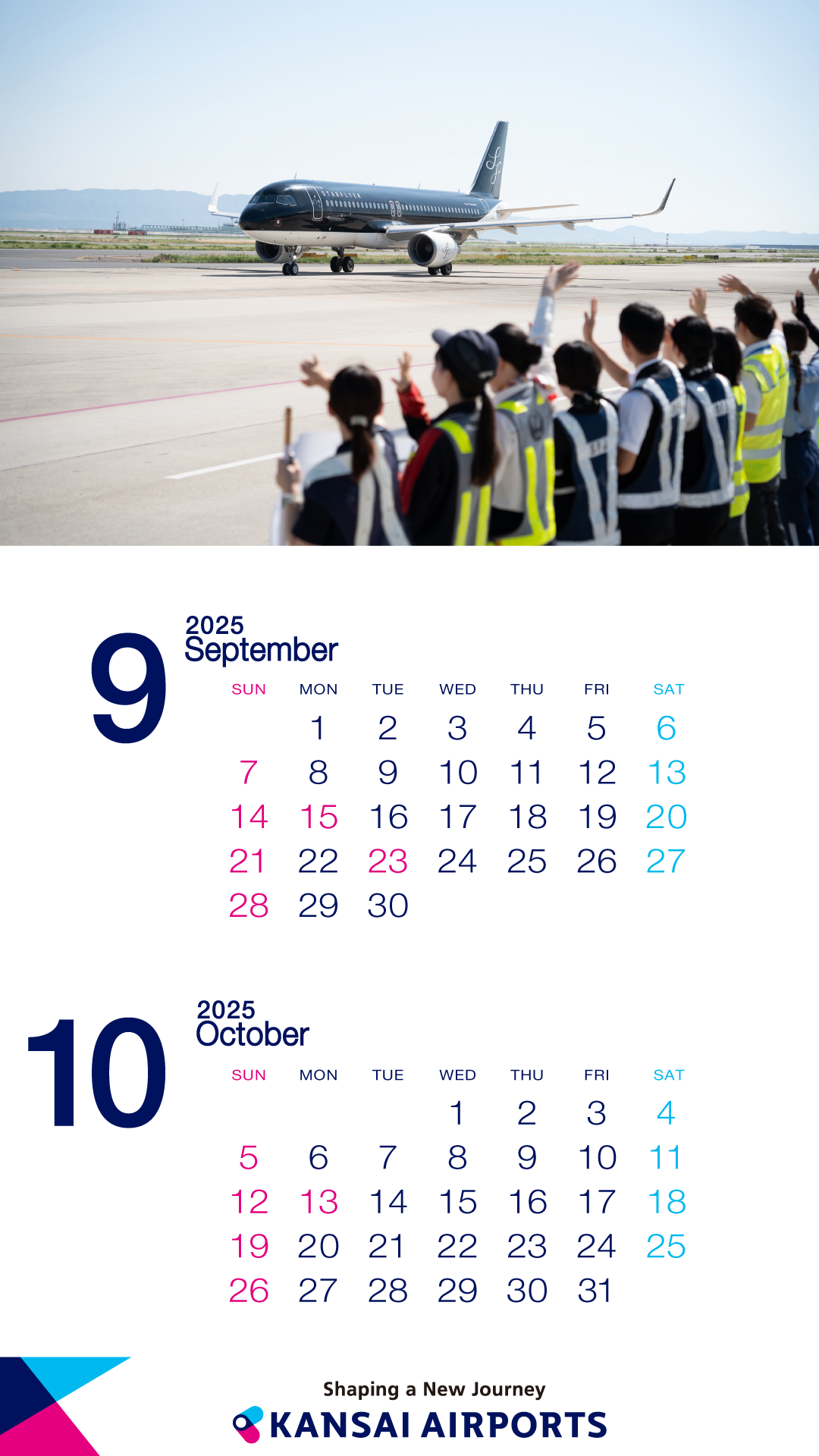 いつも空港や航空機の美しい情景に触れていただき、空に想いを馳せていただきたいという願いをこめて制作しました。お手持ちのデバイスのデスクトップや壁紙に設定してお使いいただくことができます。4ヶ月ごとにカレンダーをまとめた、ビジネスシーンにも便利な関西3空港バージョンと、2ヶ月ごとに変化する風景をお楽しみいただけるバージョン(各2種類)です。2025年も関西3空港からの風景をお楽しみください。
