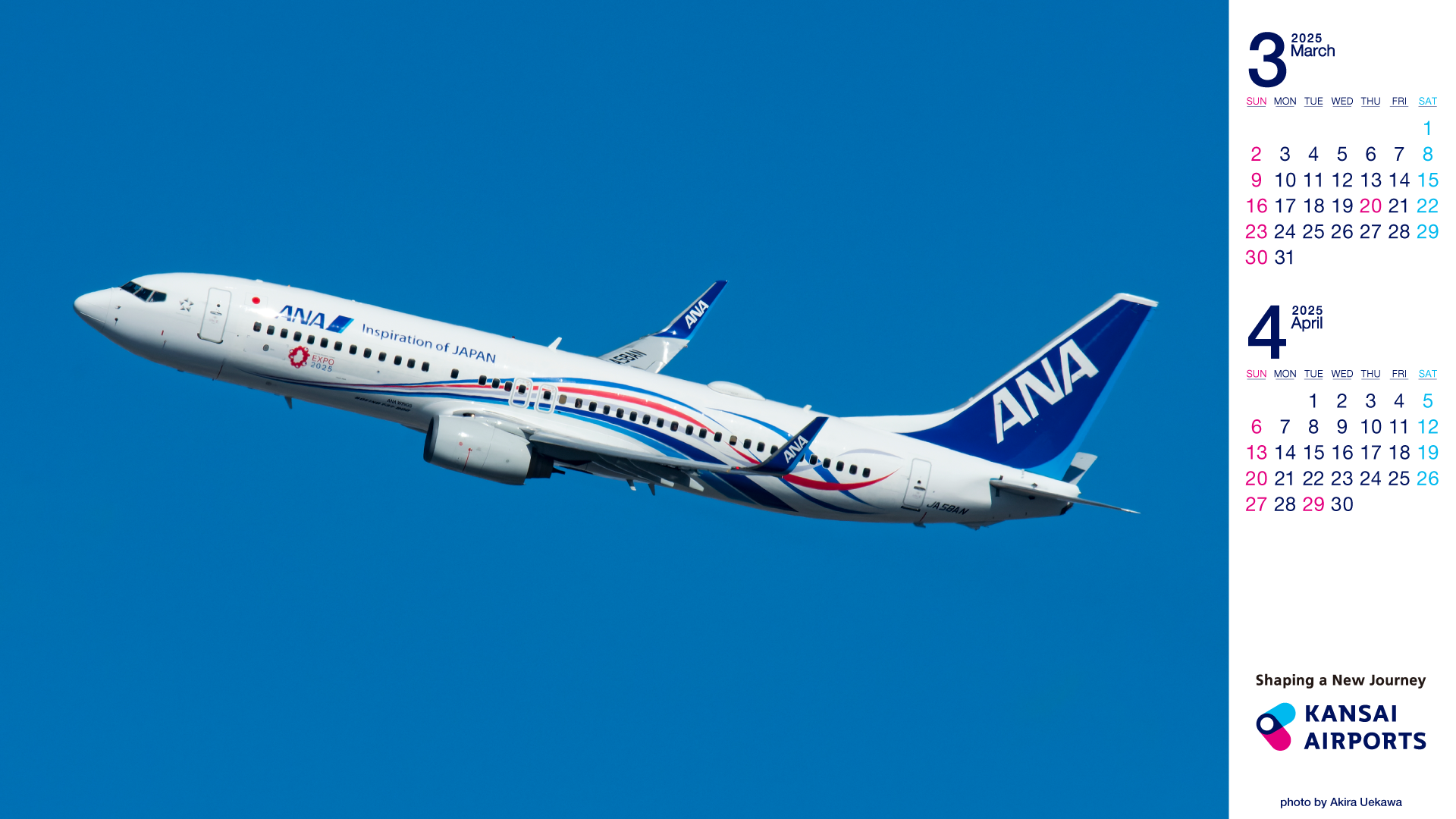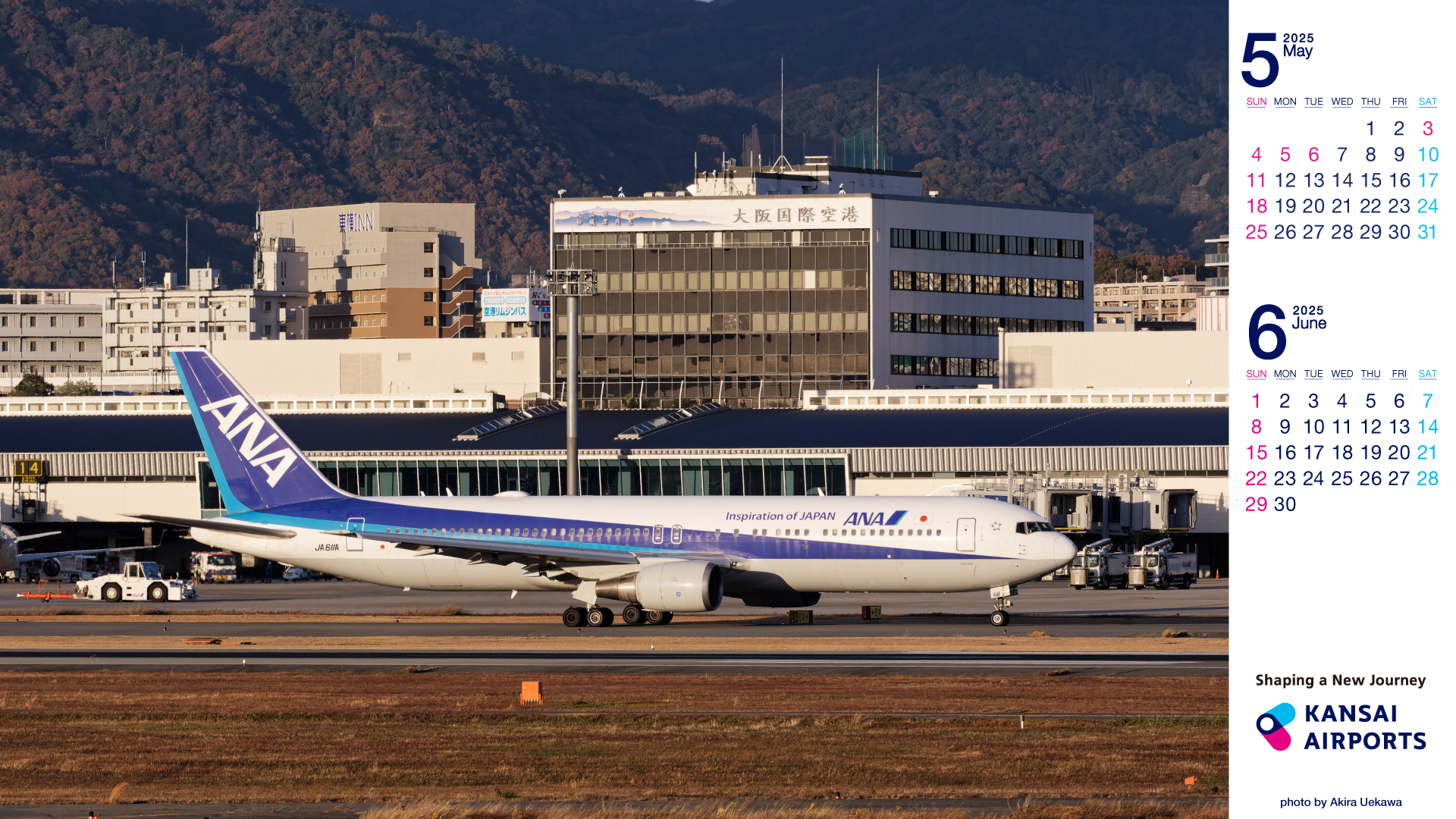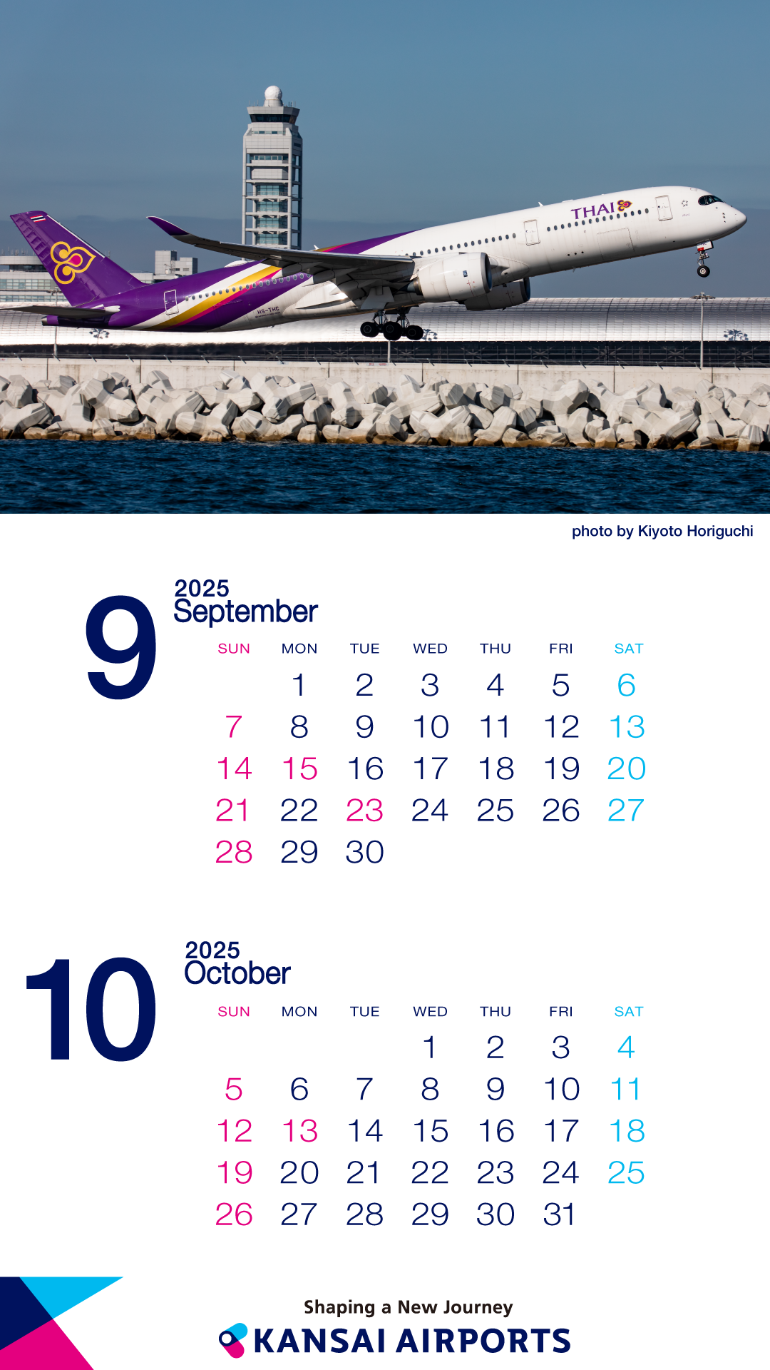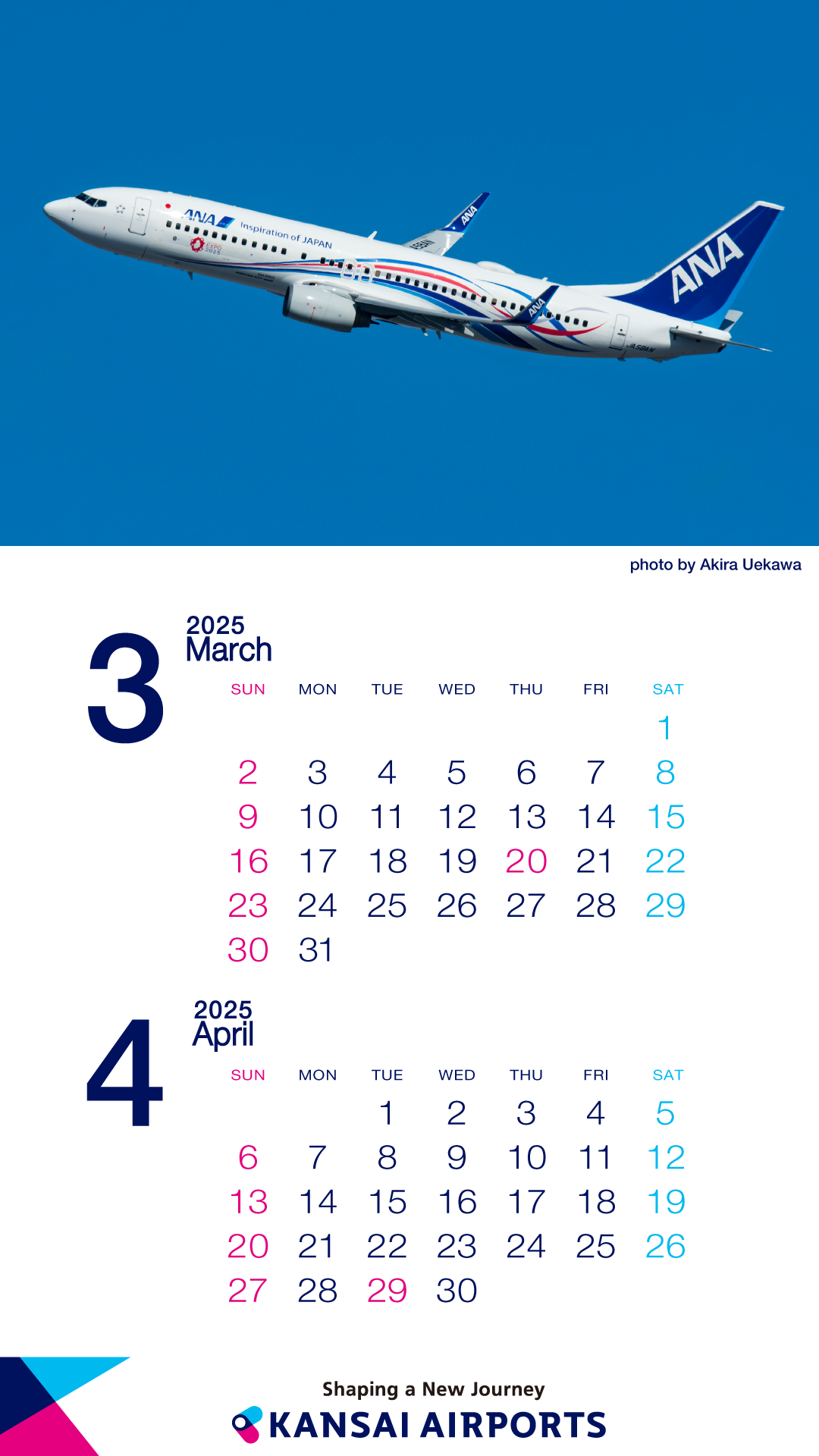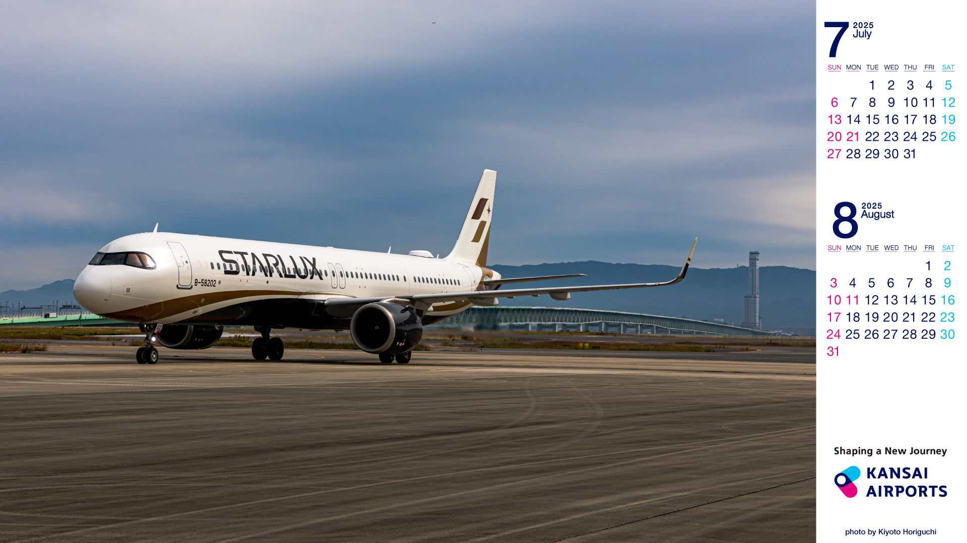 いつも空港や航空機の美しい情景に触れていただき、空に想いを馳せていただきたいという願いをこめて制作しました。お手持ちのデバイスのデスクトップや壁紙に設定してお使いいただくことができます。4ヶ月ごとにカレンダーをまとめた、ビジネスシーンにも便利な関西3空港バージョンと、2ヶ月ごとに変化する風景をお楽しみいただけるバージョン(各2種類)です。2025年も関西3空港からの風景をお楽しみください。