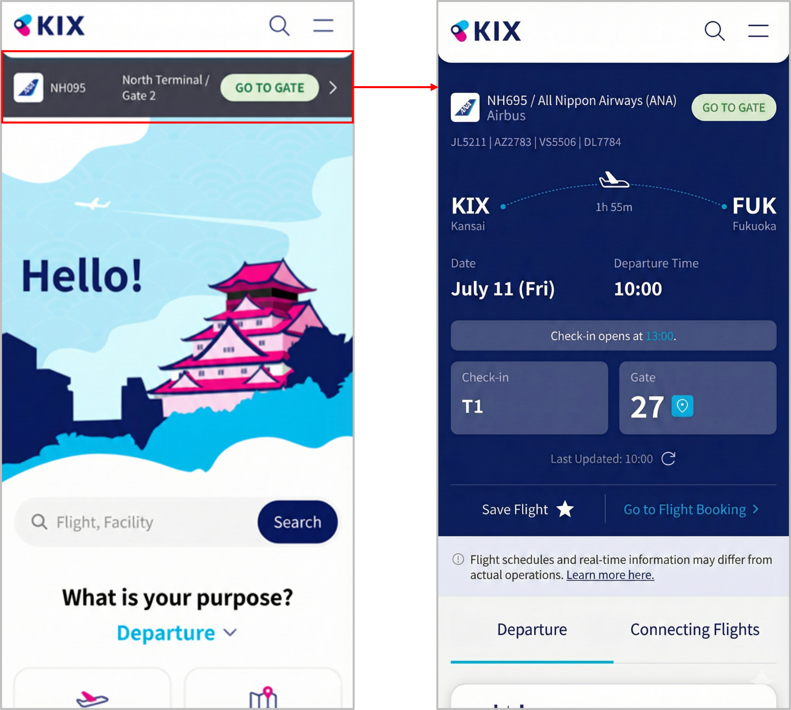 The page shows useful information for travel preparation, boarding and spending time at the airports, to provide pre-travel support to airport users. An additional feature allowing users to bookmark their flights is scheduled. This feature will notify users when and which gate they need to go to for flights they have bookmarked in advance.