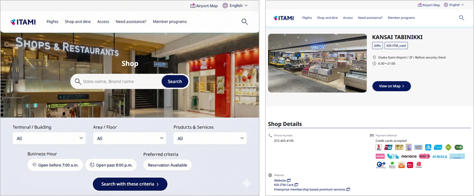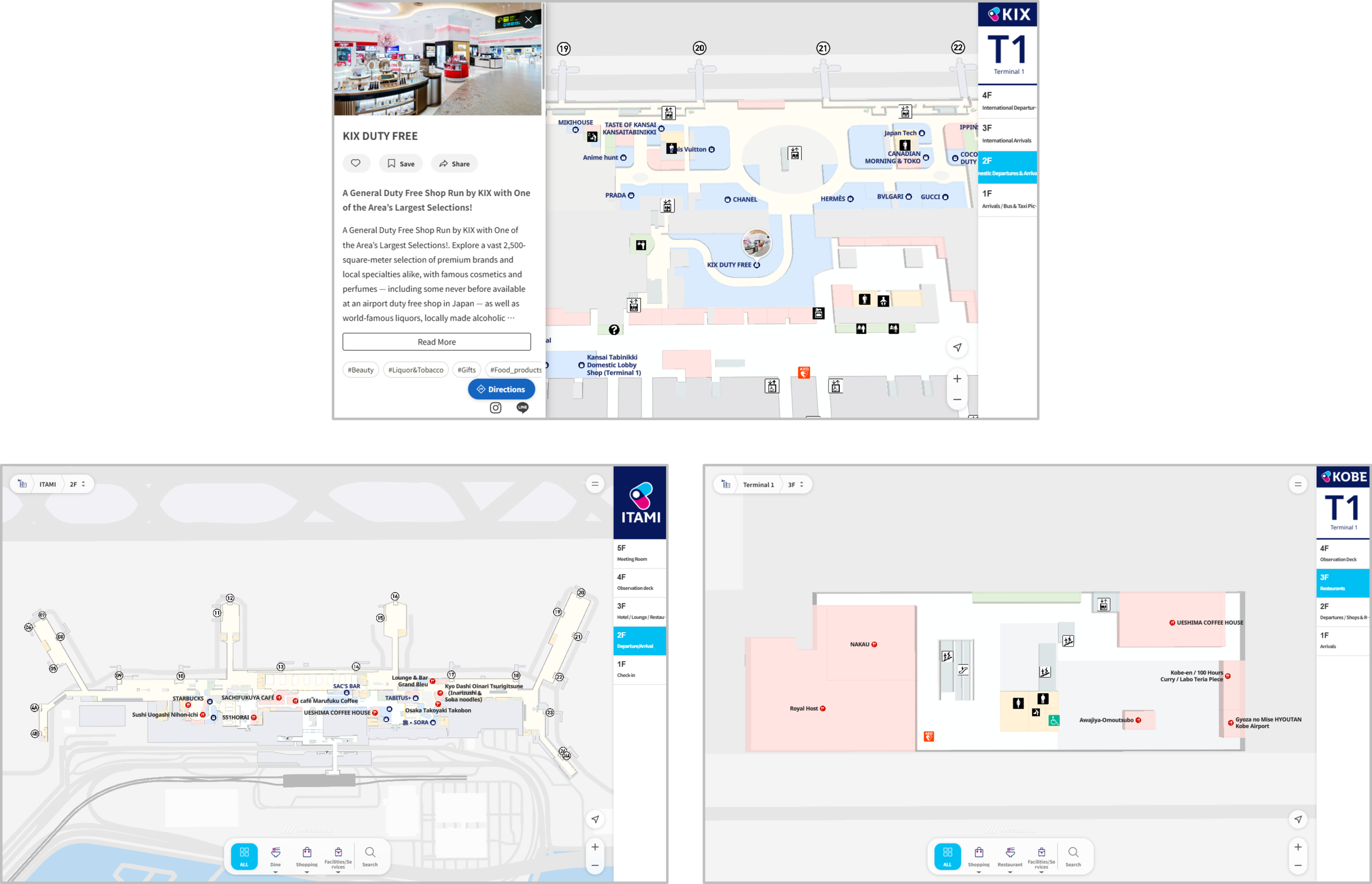 The websites have been renewed with improved content structure, design, and functionality to help airport users easily find the information they need and take the next action smoothly. Users can find information useful in various situations, such as dining and shopping at the airports, participating in events, enjoying aircraft viewing, as well as navigating departure, arrival and transit processes. The websites also offer improved accessibility to real-time flight information as well as commercial and restaurant information. With the facility search linked with the floor map, users can go through the process from searching where they want to go, locating it, and checking the details more seamlessly.