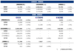 ●関西国際空港の外国人旅客数は前年同月比109%と前年を上回り、日本人旅客数も同120%と前年を大きく上回った結果、国際線旅客数は236万人となりました。