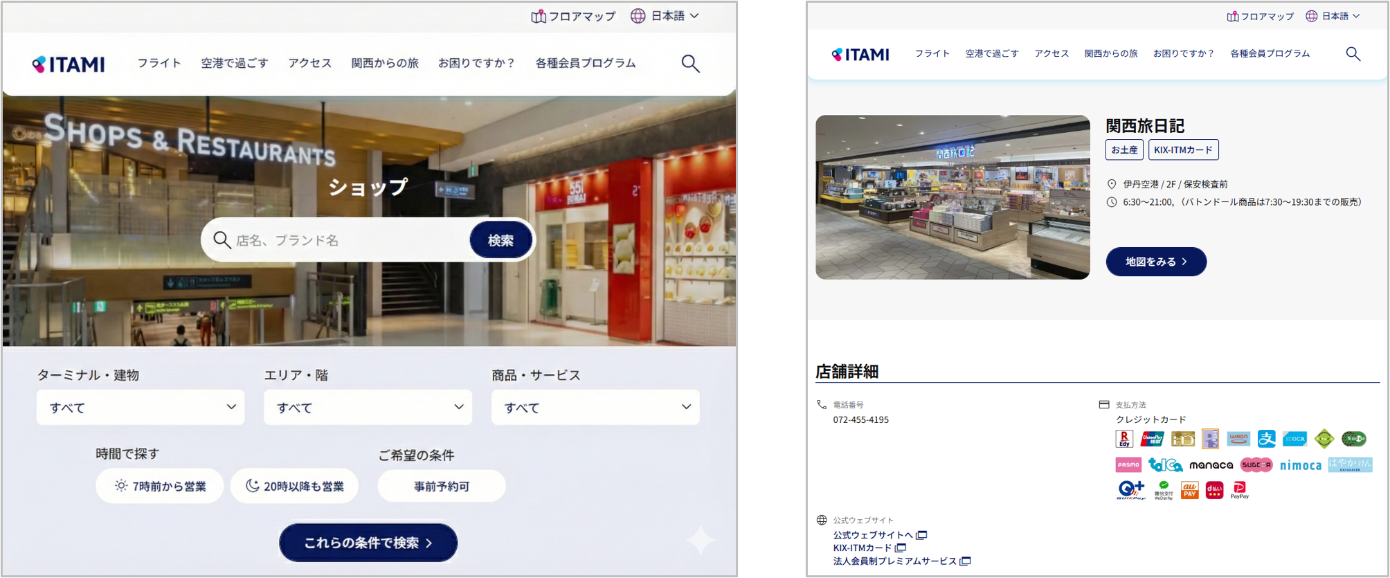 検索機能の項目を整理し、利便性を強化。また、店舗などの詳細情報は空港利用者にとって優先度の高いカテゴリー、場所、営業時間、決済方法などを優先して表示し、インタラクティブ・フロアマップへ埋め込むことで空港体験の充実をサポートします。