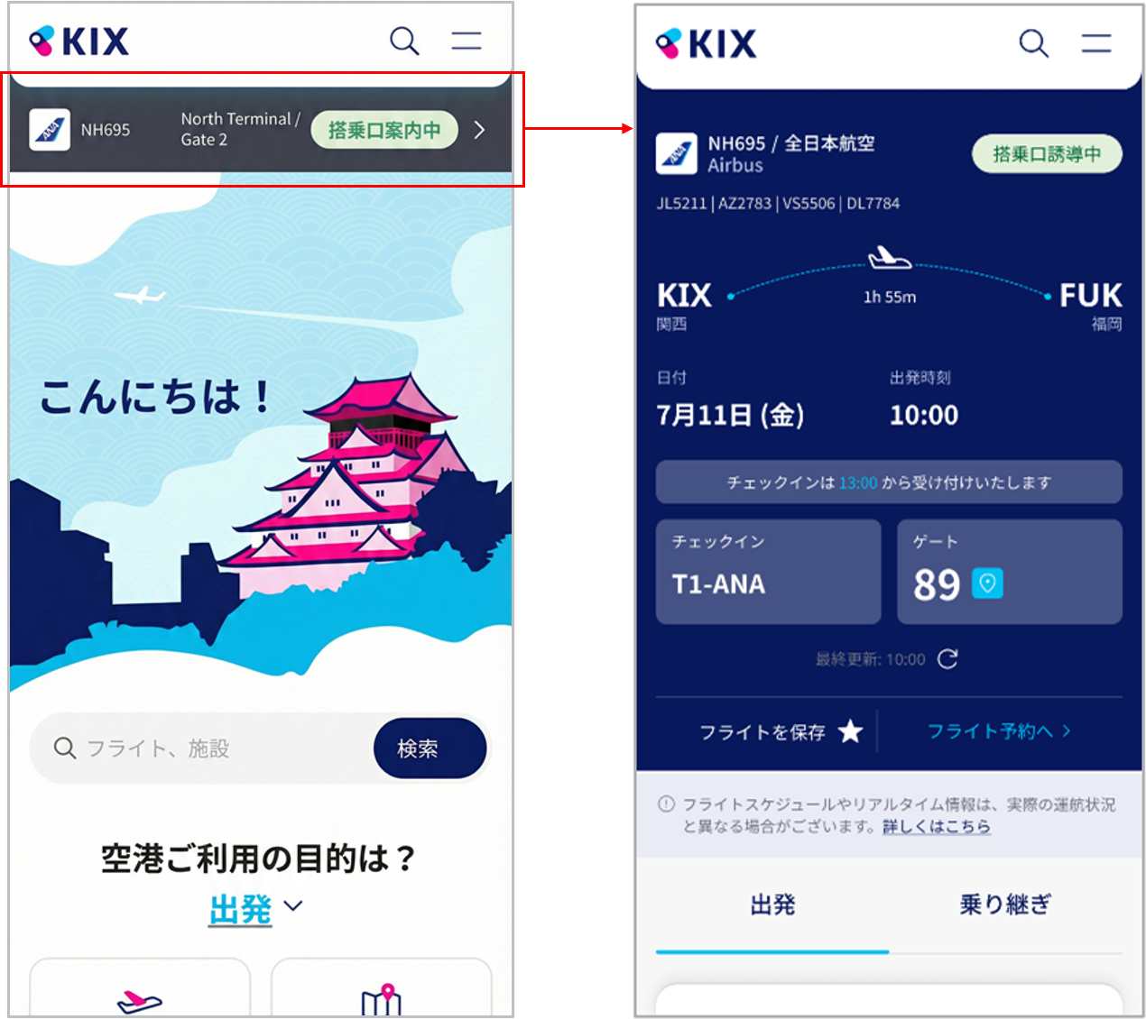 旅行の準備や搭乗の注意点、空港での過ごし方など役立つ情報を発信し、旅前から空港利用者をサポートします。また、搭乗予定のフライトをブックマークできる機能を追加予定※。出発前に自分のフライト情報を保存しておけば、何時にどのゲートに行けばよいのかすぐに確認できます。